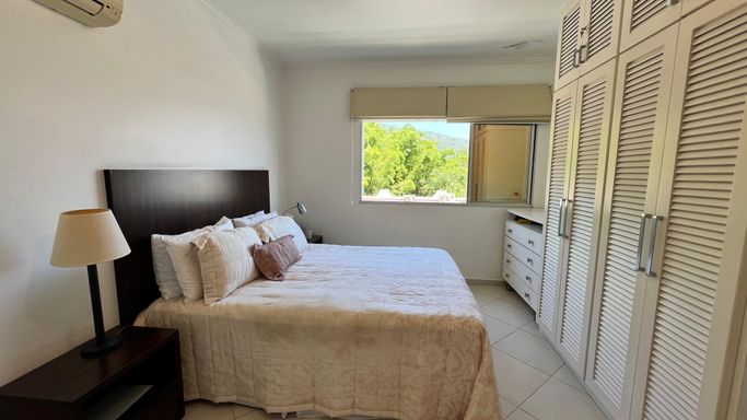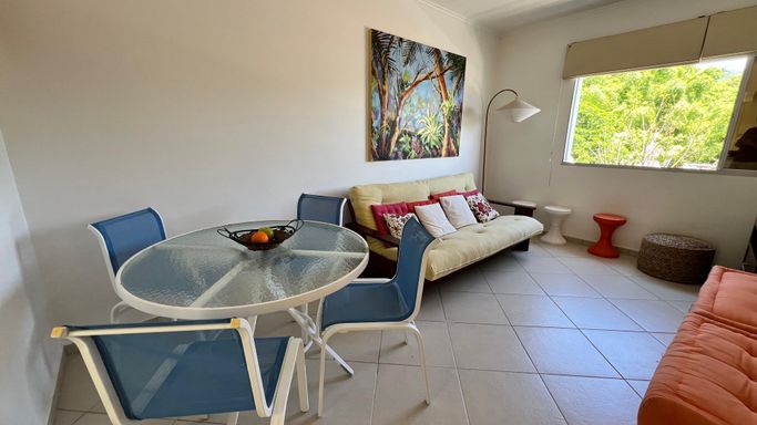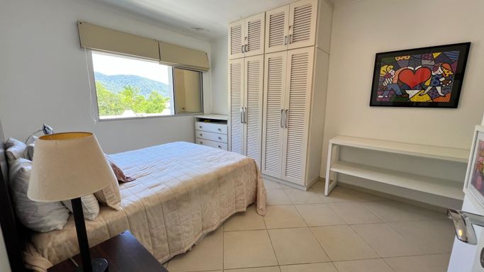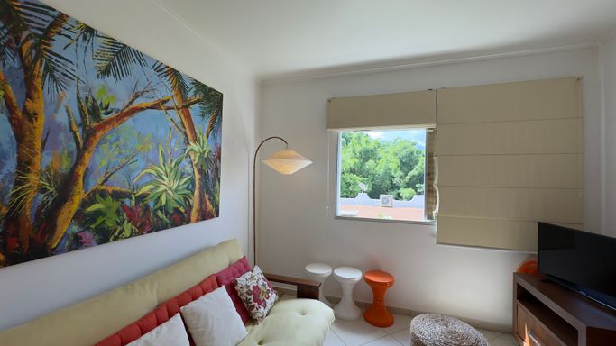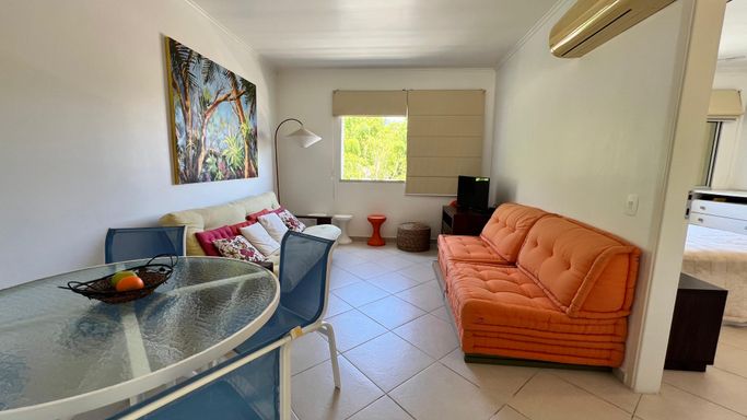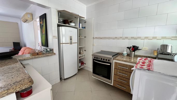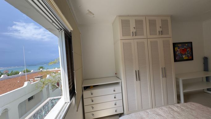Vista permanente para o mar. Uma suíte ampla com armários e ar condicionado. Sala em 2 ambientes com ar condicionado, Cozinha americana com armários. banheiro/área de serviço.