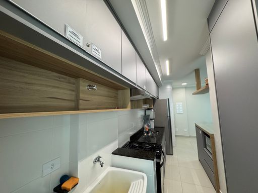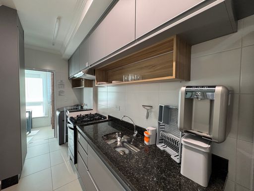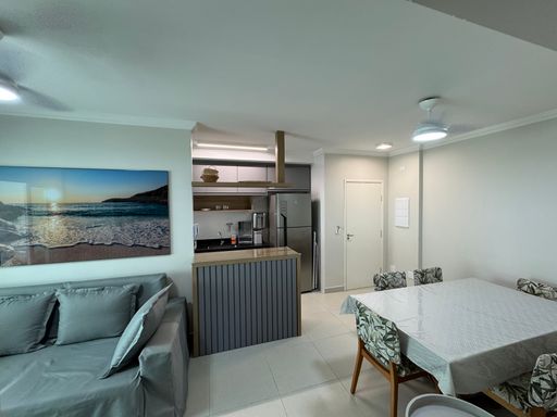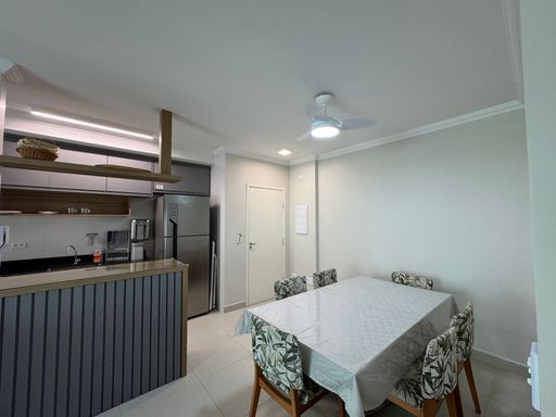 Cozinha americana com armários planejados com fogão e forno, micro-ondas, coifa, geladeira. Sala de jantar com mesa de 6 lugares, capa aquablock para proteção do estofado, ventiladores.
