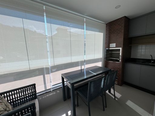 Sala com tv, sofá cama, ambiente integrado com sacada gourmet e churrasqueira, mesa e cadeiras com vista para a mata, fechamento com vidro e cortinas com persiana.