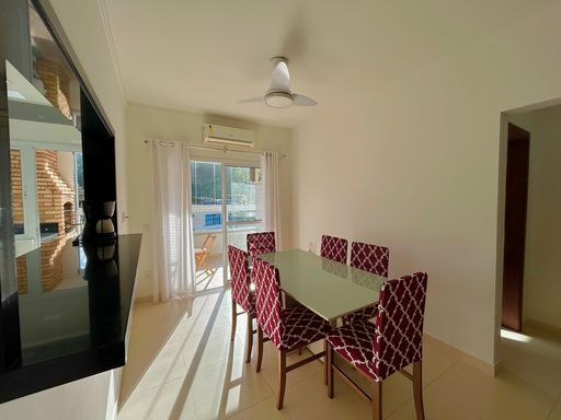 Apartamento Amplo com 86m² útil, 2 quartos sendo 1 suíte com ar condicionado e armários, sala em 2 ambientes com ventiladores de teto, cozinha americana com armários, área de serviço, sacada com churrasqueia.